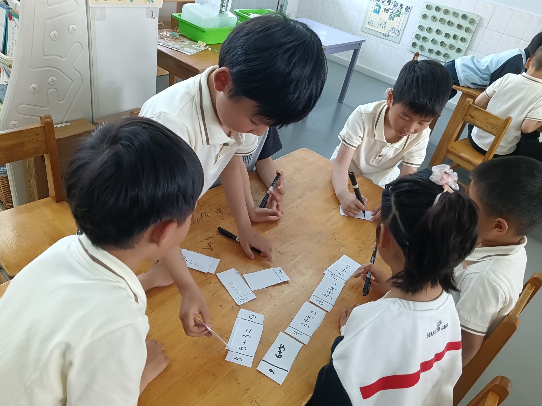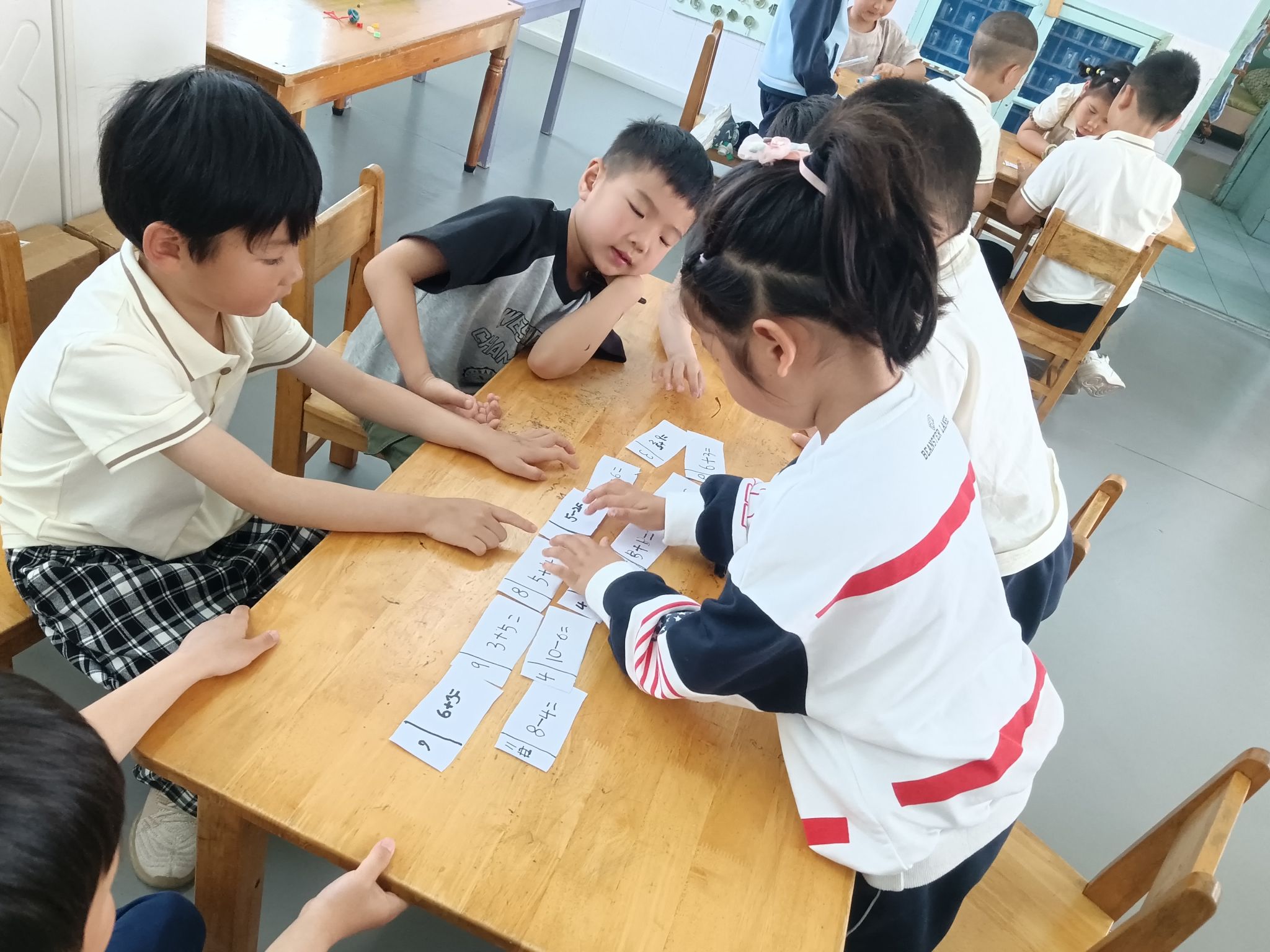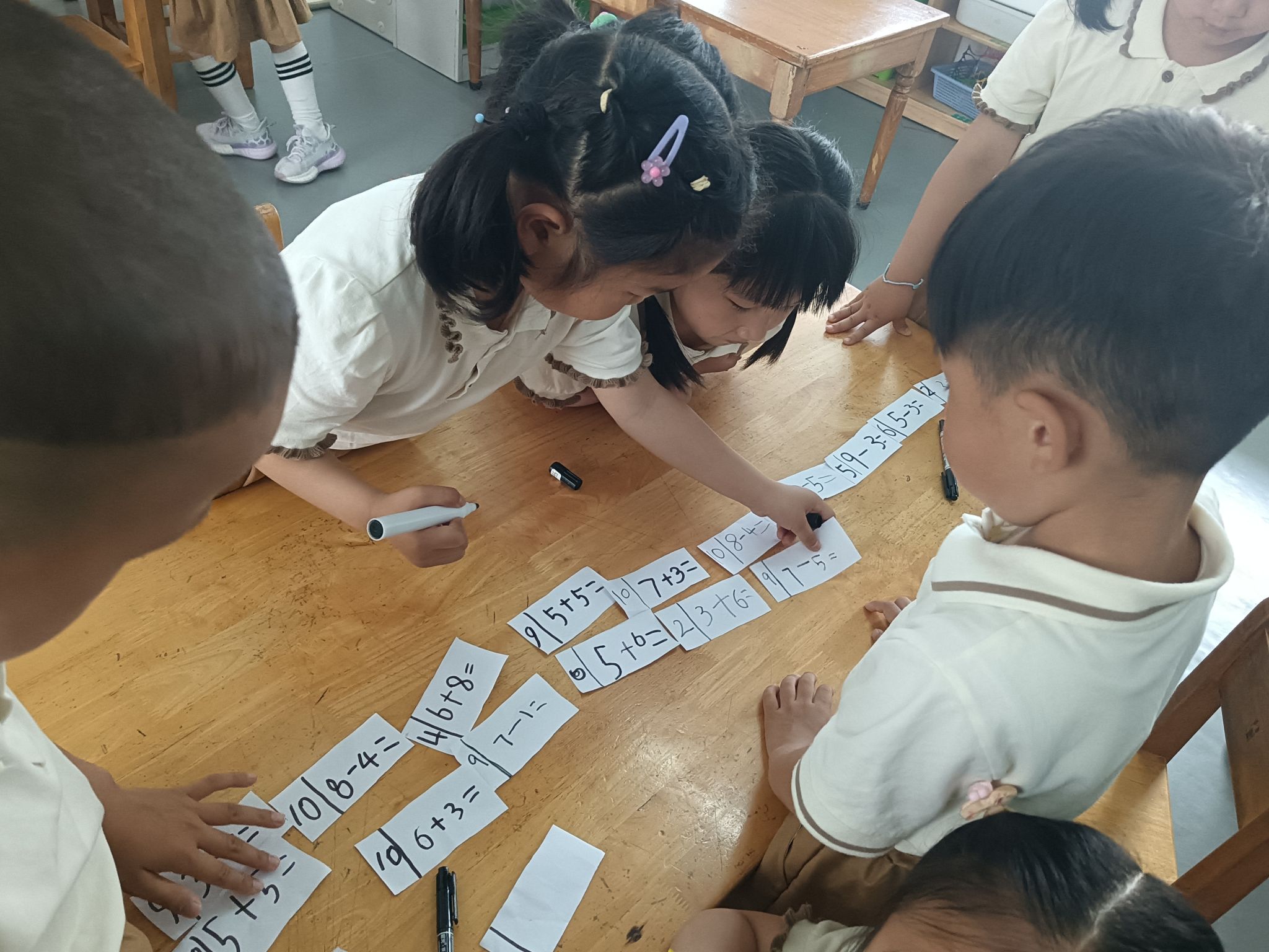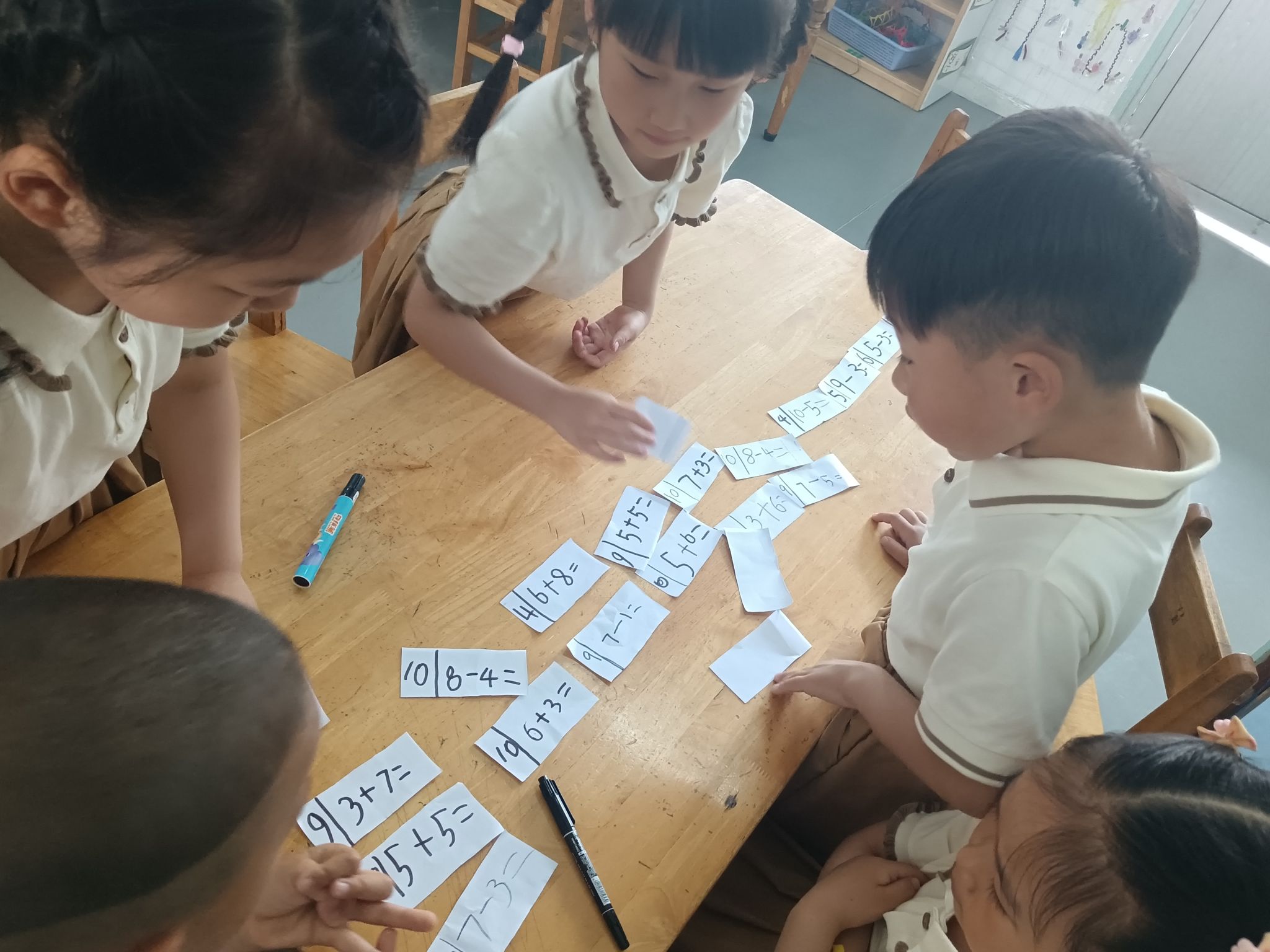 在看图列算式掌握的情况下,孩子们也尝试着自己编应用题,在理解加法交换率与加减的互逆关系的基础上,一起分组来玩一玩算式接龙,巩固对10以内加减法的编题、计算。
