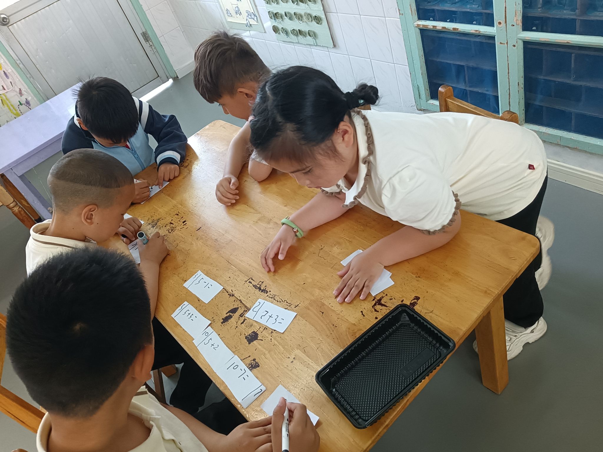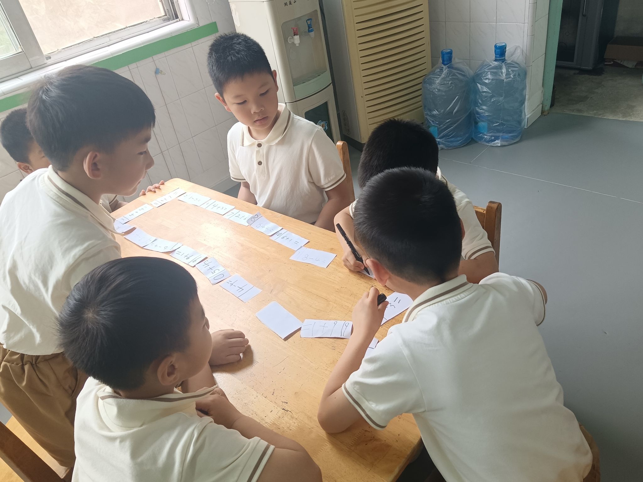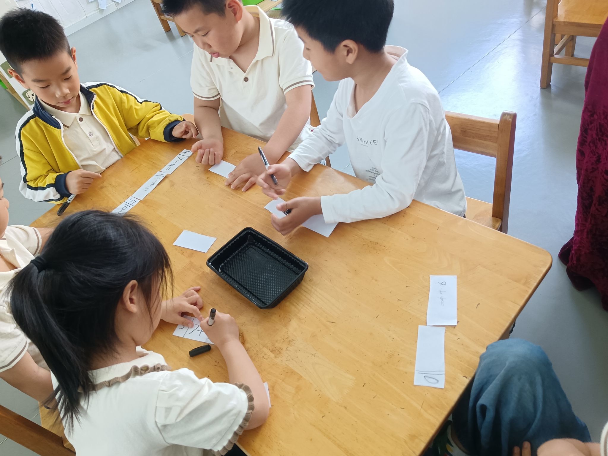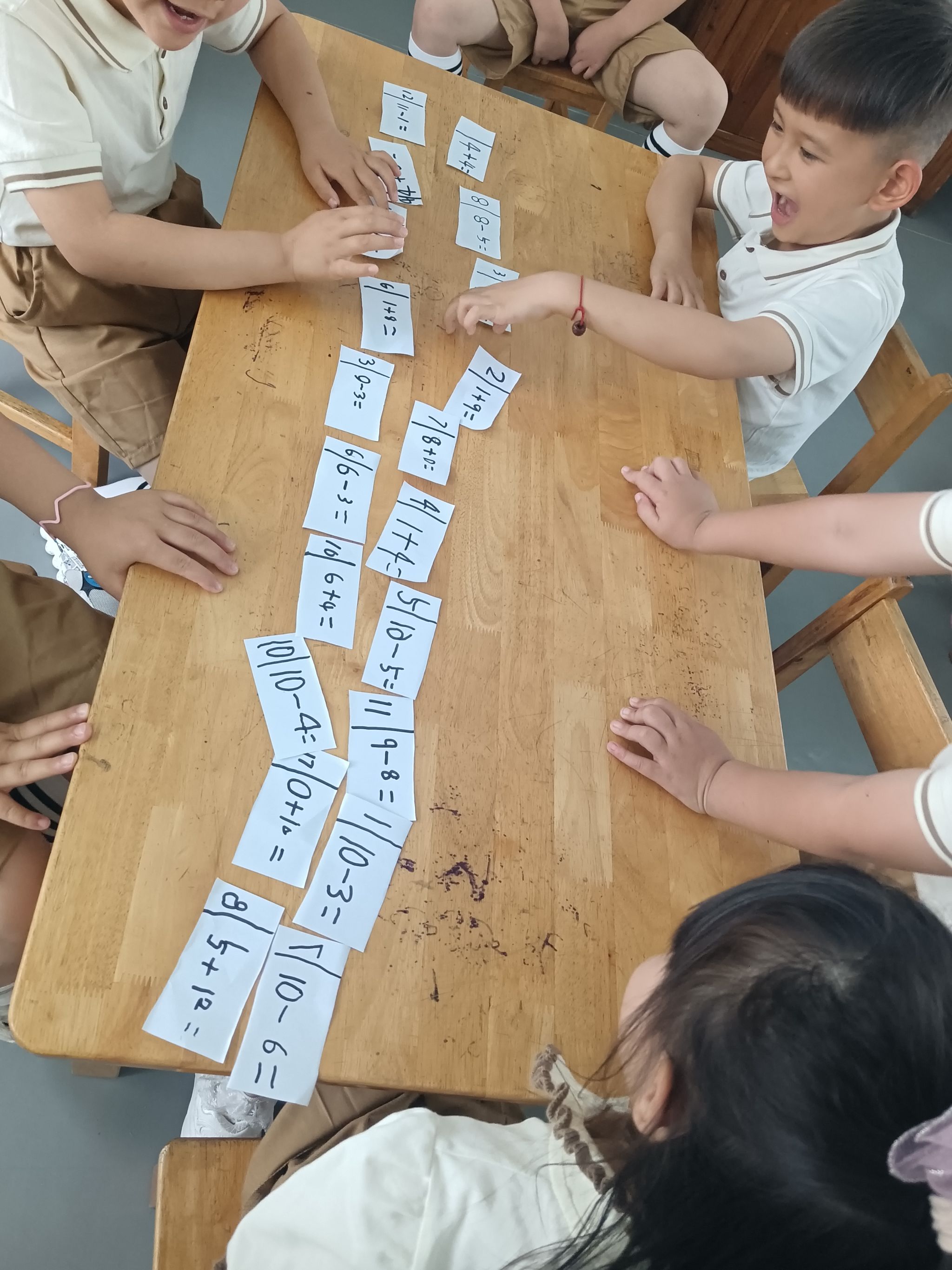 在看图列算式掌握的情况下,孩子们也尝试着自己编应用题,在理解加法交换率与加减的互逆关系的基础上,一起分组来玩一玩算式接龙,巩固对10以内加减法的编题、计算。