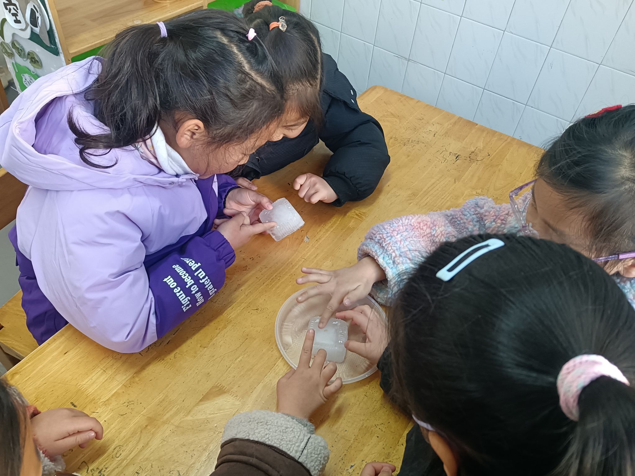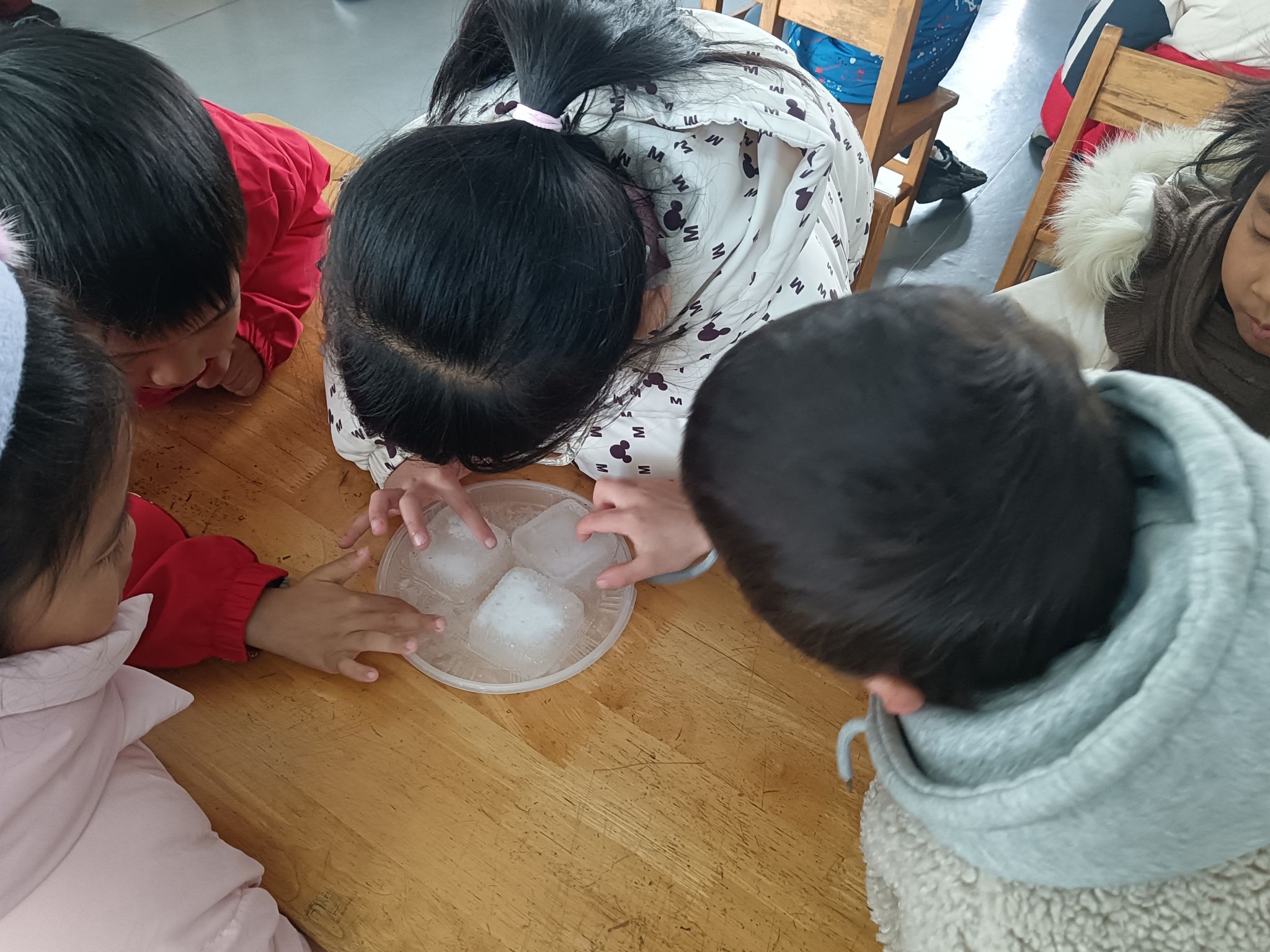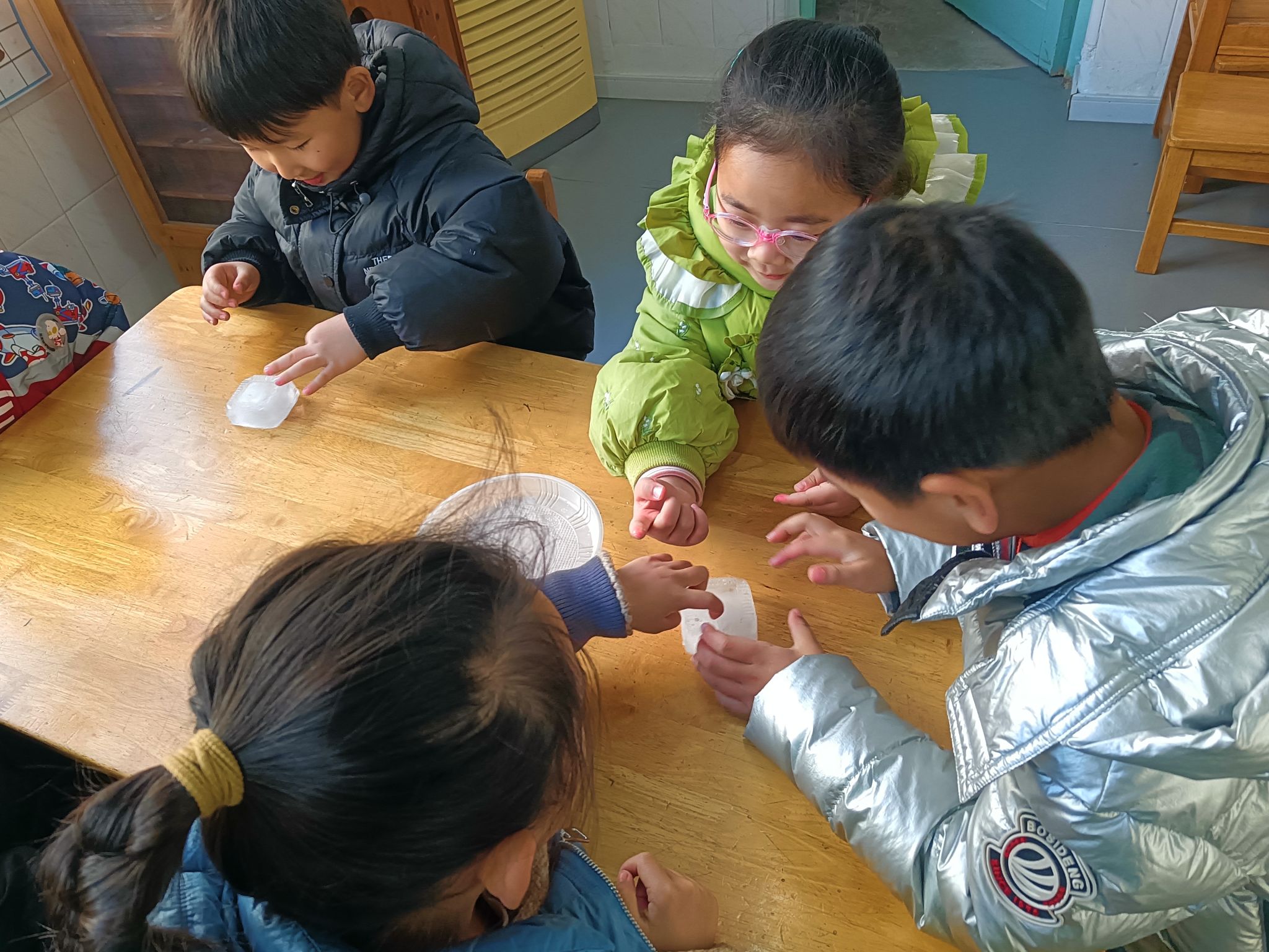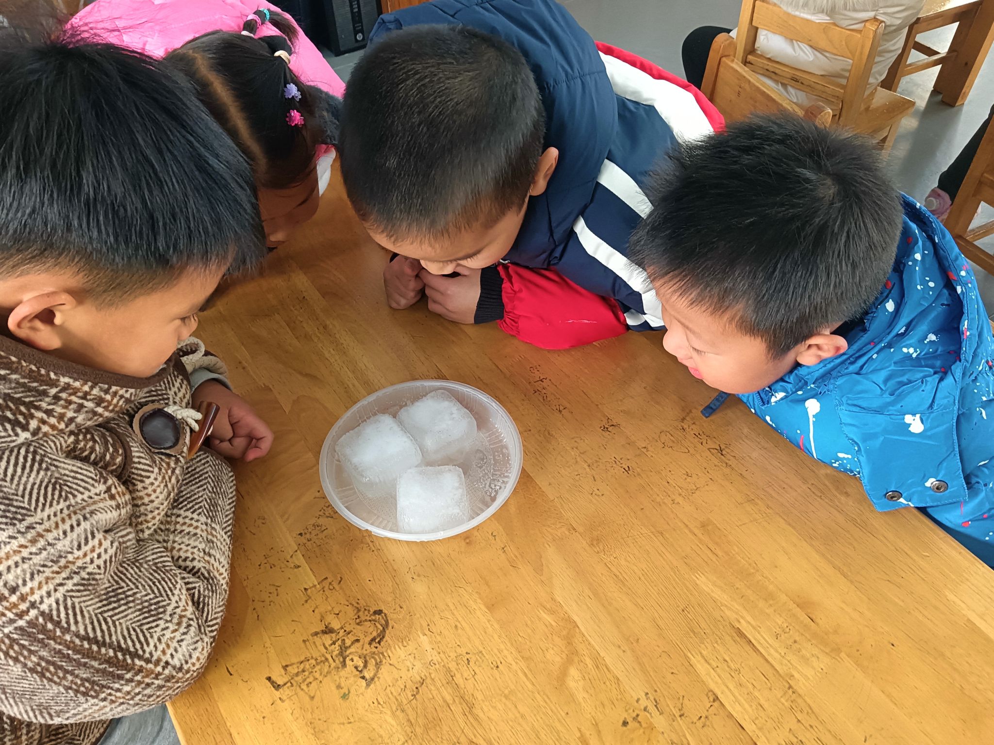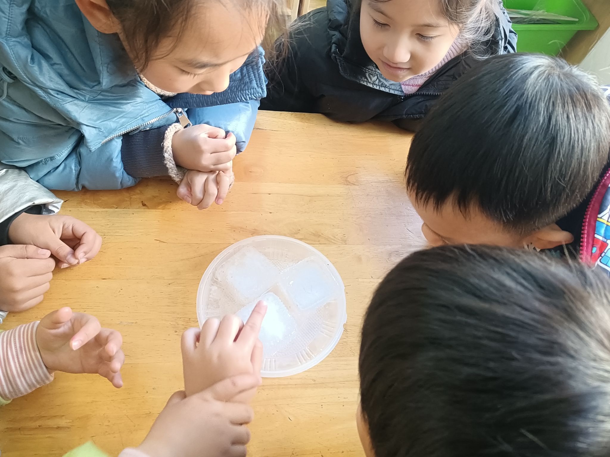 这两天,天气降温,已到零下几度,孩子们在幼儿园里发现很多处结冰的现象,根据孩子们的探索需求,我们带着孩子做一做化冰实验,了解冰的融化过程,观测并记录冰块融化的现象,在探究的过程中养成在实验观察活动中认真、细致的态度,体验科学活动的乐趣。