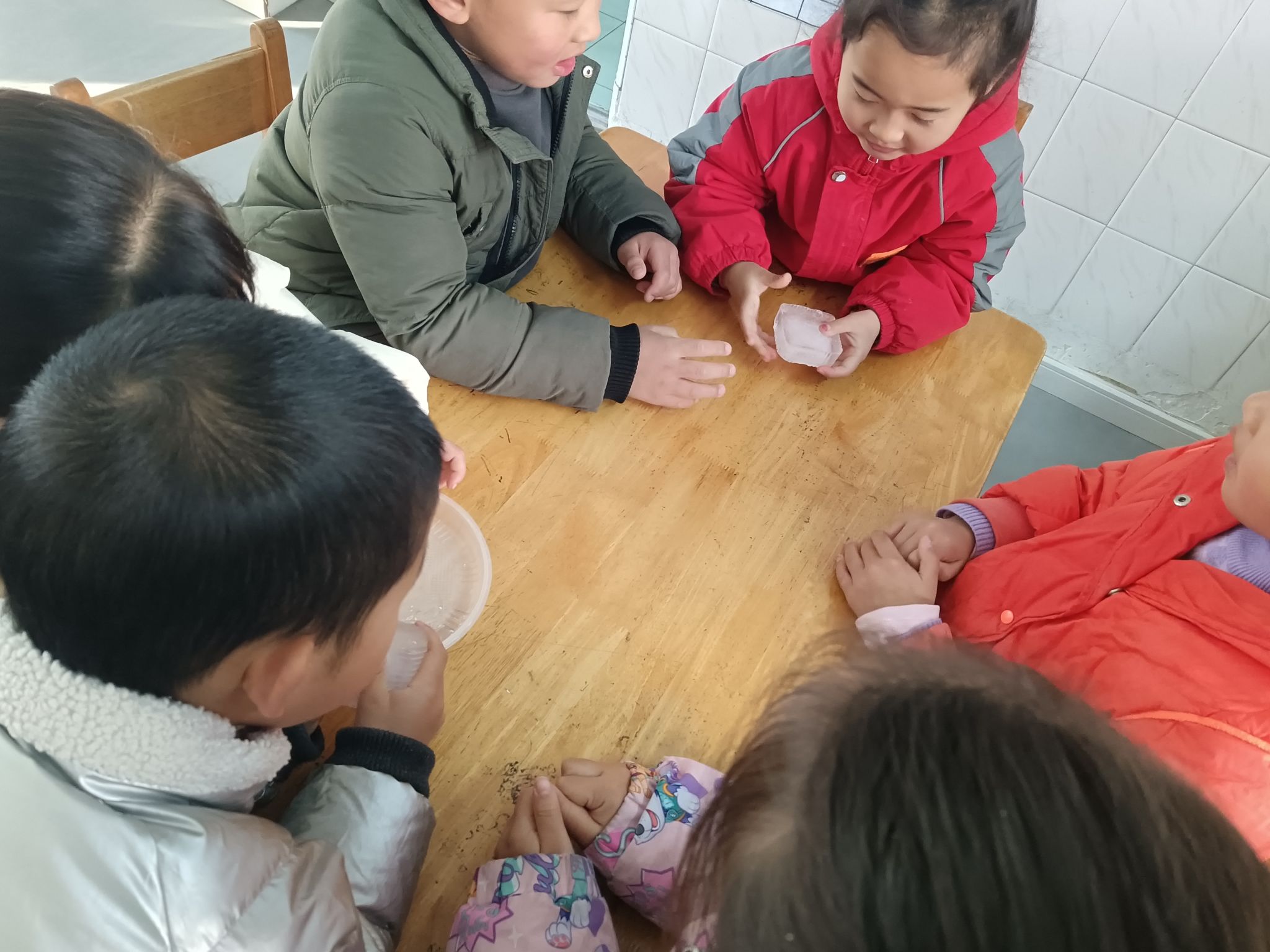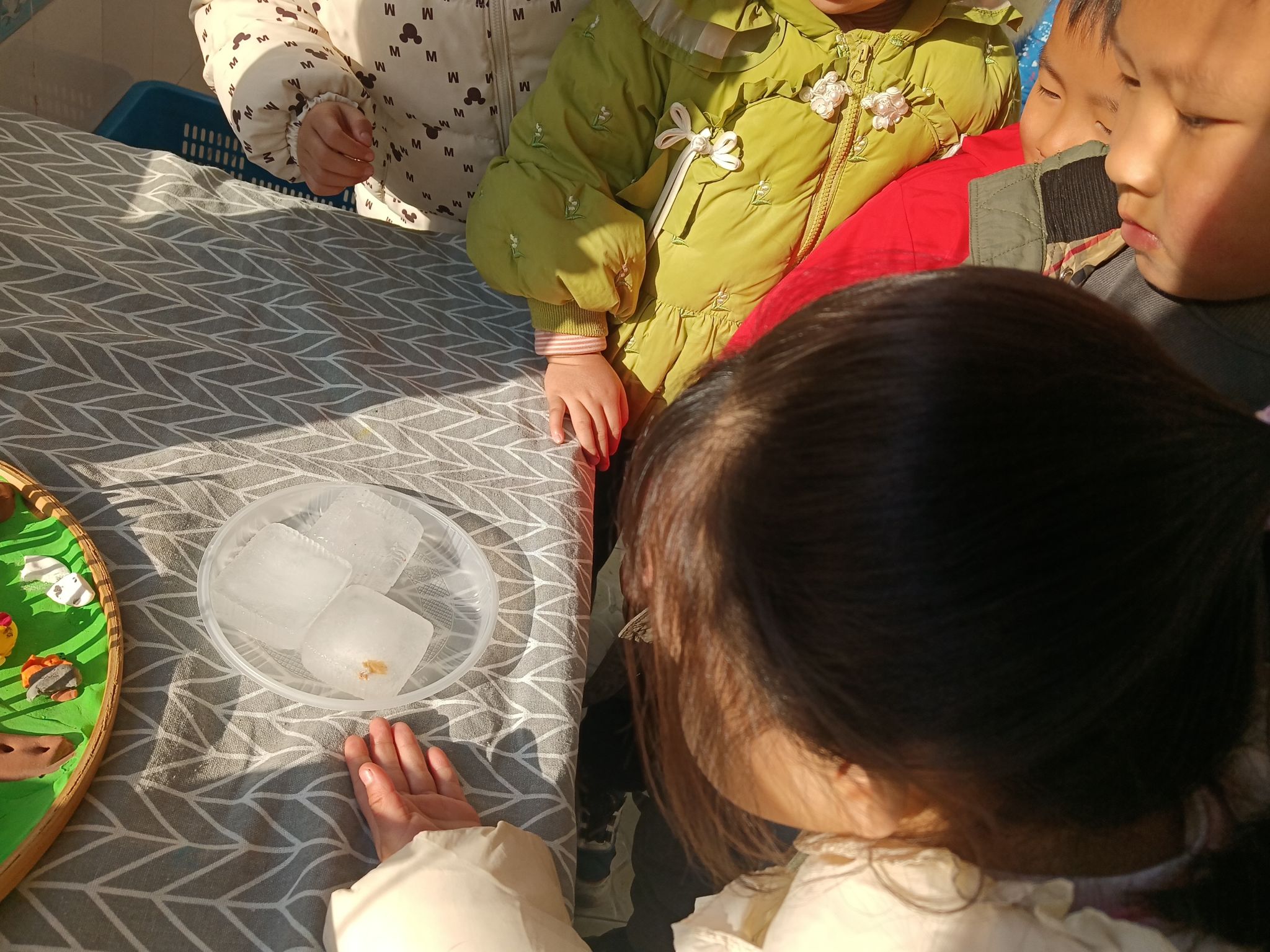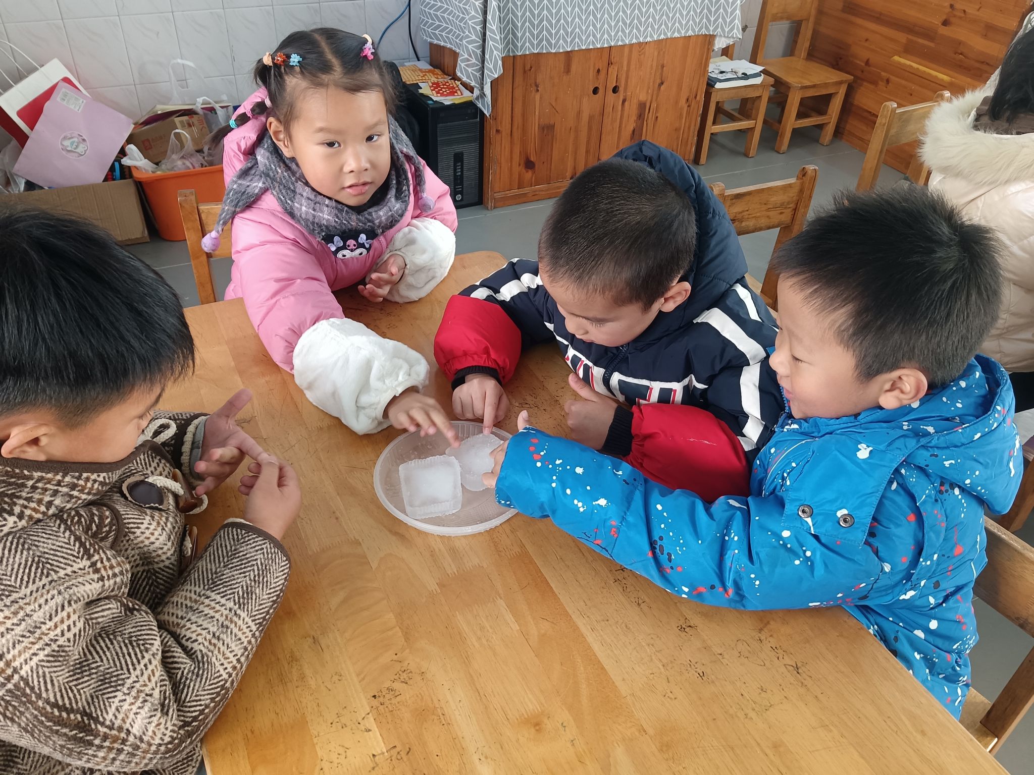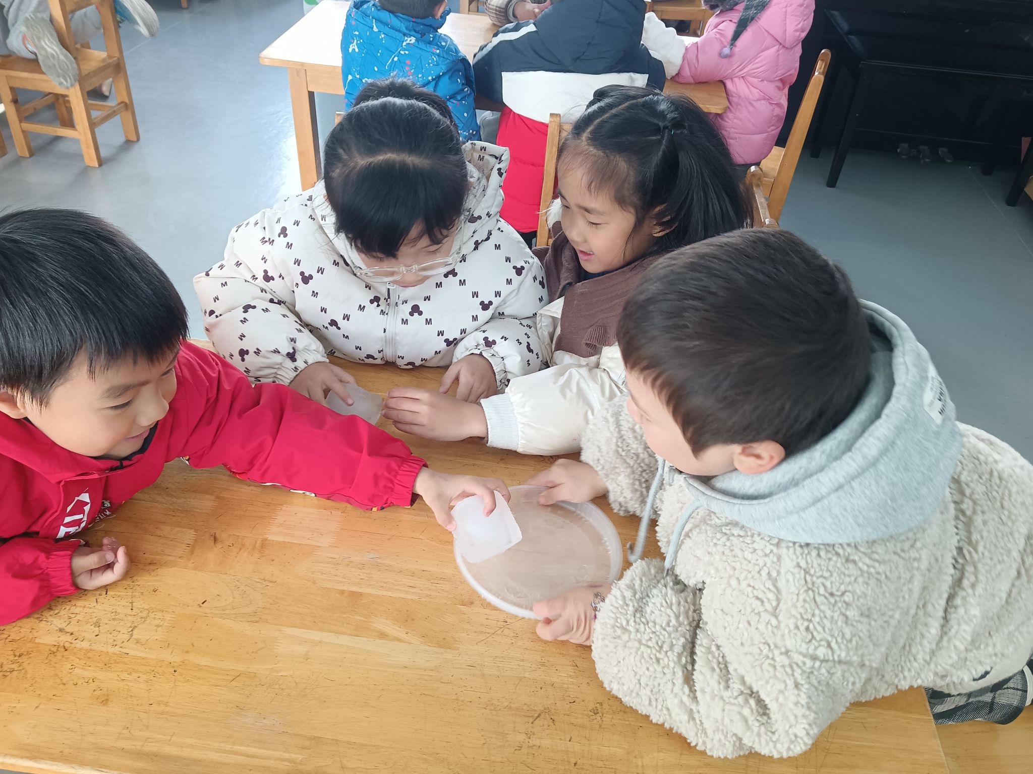 这两天,天气降温,已到零下几度,孩子们在幼儿园里发现很多处结冰的现象,根据孩子们的探索需求,我们带着孩子做一做化冰实验,了解冰的融化过程,观测并记录冰块融化的现象,在探究的过程中养成在实验观察活动中认真、细致的态度,体验科学活动的乐趣。