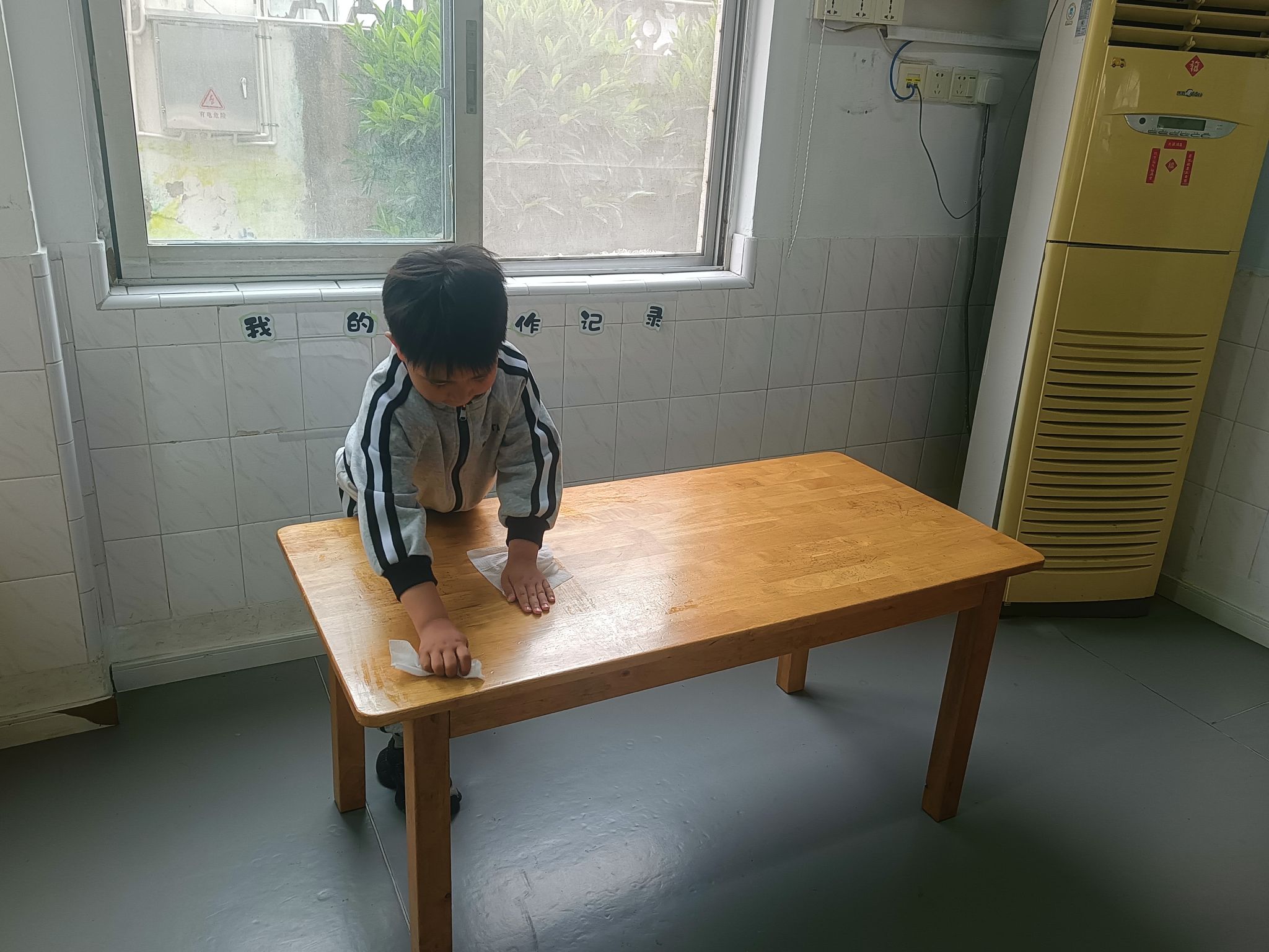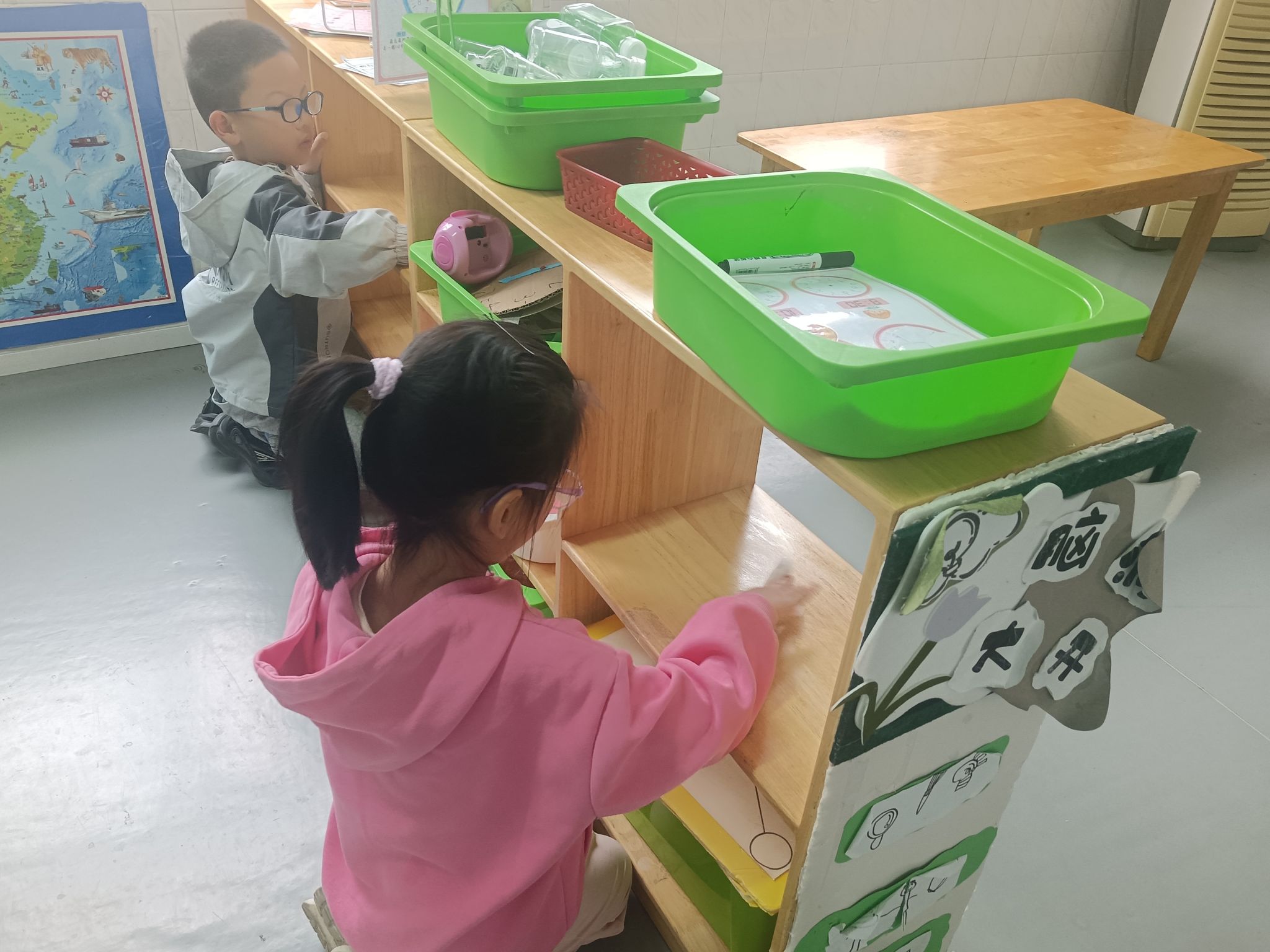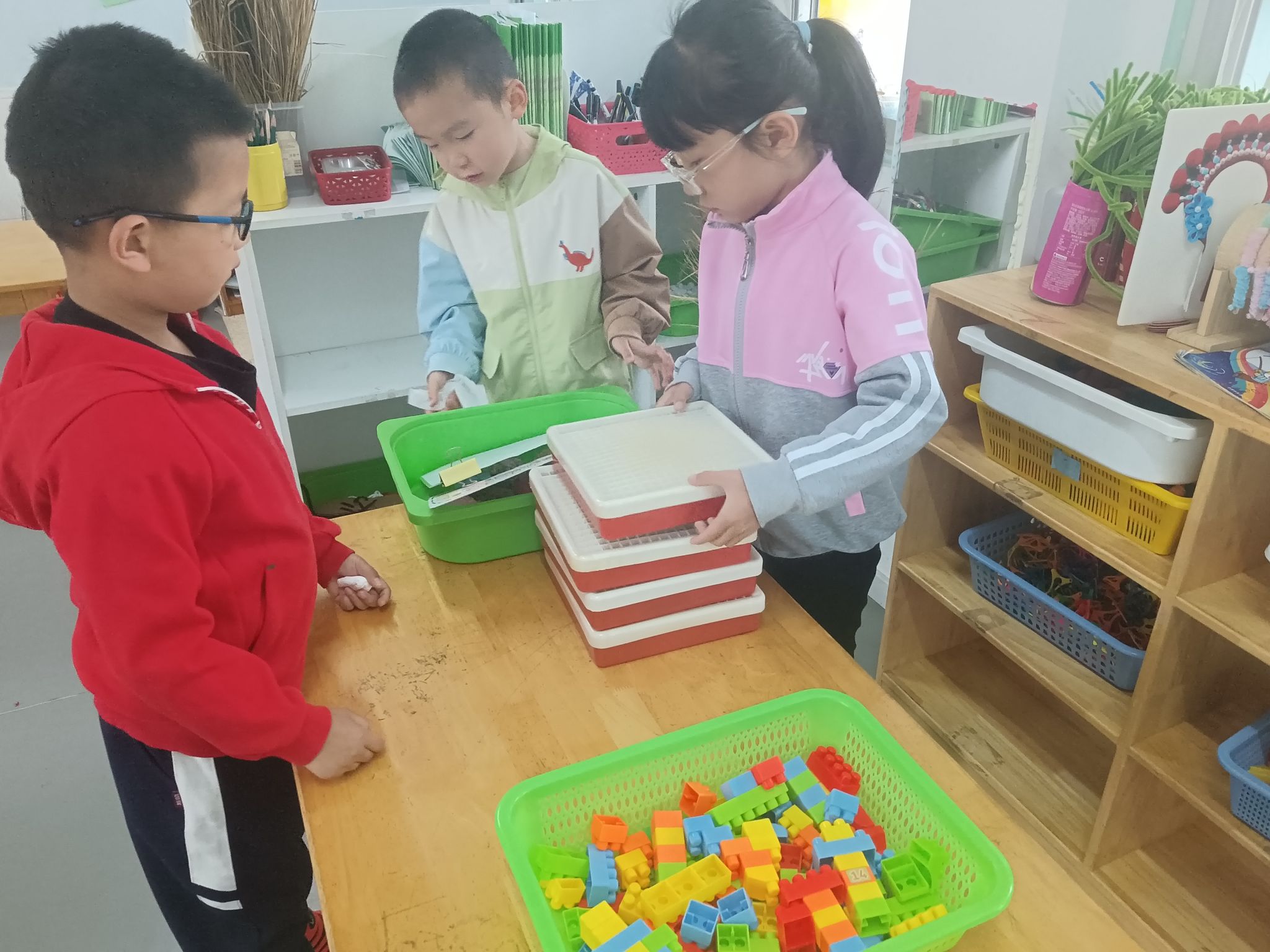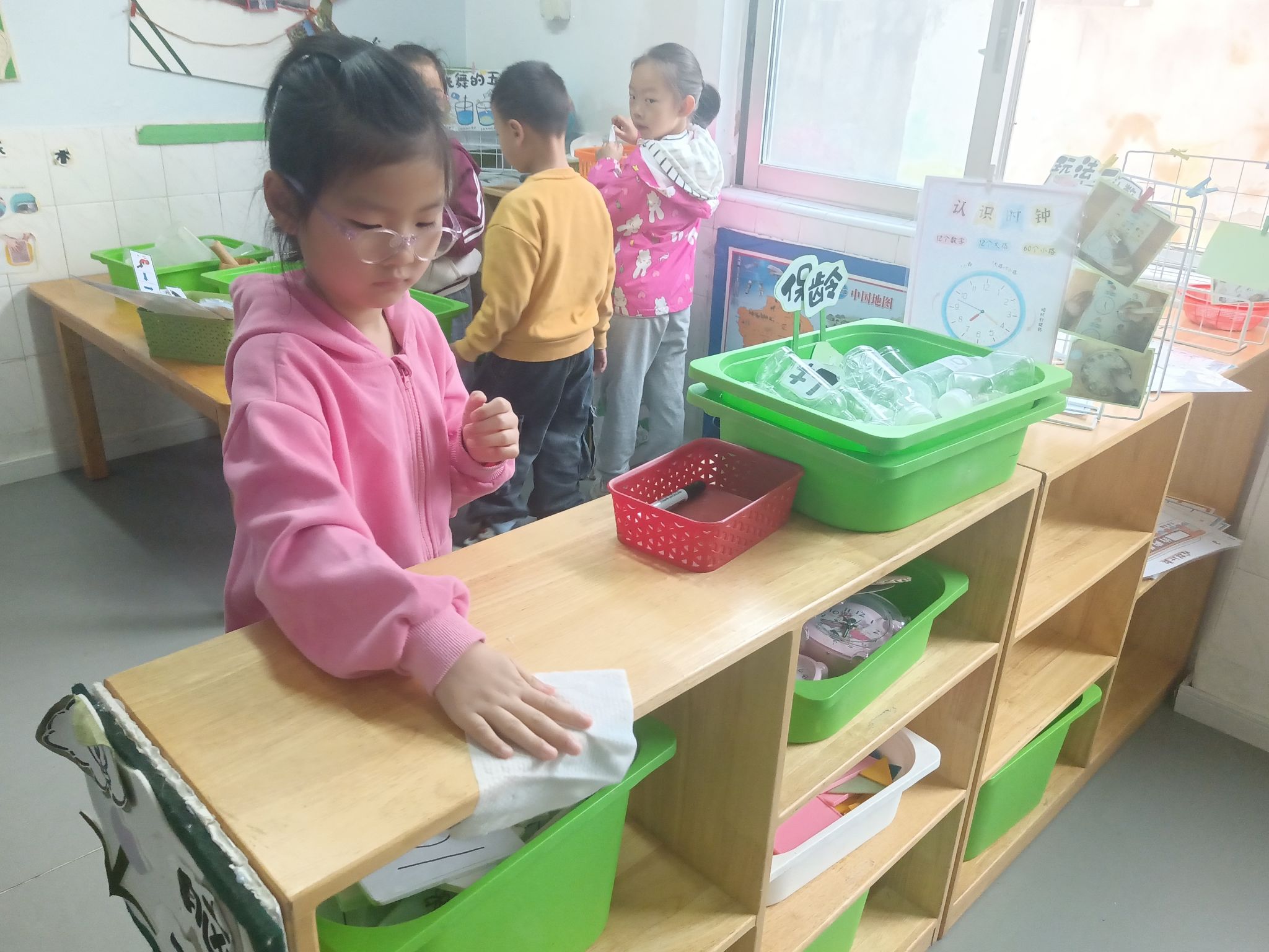 马上就要劳动节了,孩子们一起讨论“劳动节我们要做些什么?”,大家一致决定把教室整理、清洁一下,你看!游戏区角、玩具柜、桌面、玩具,每个地方都不落下......