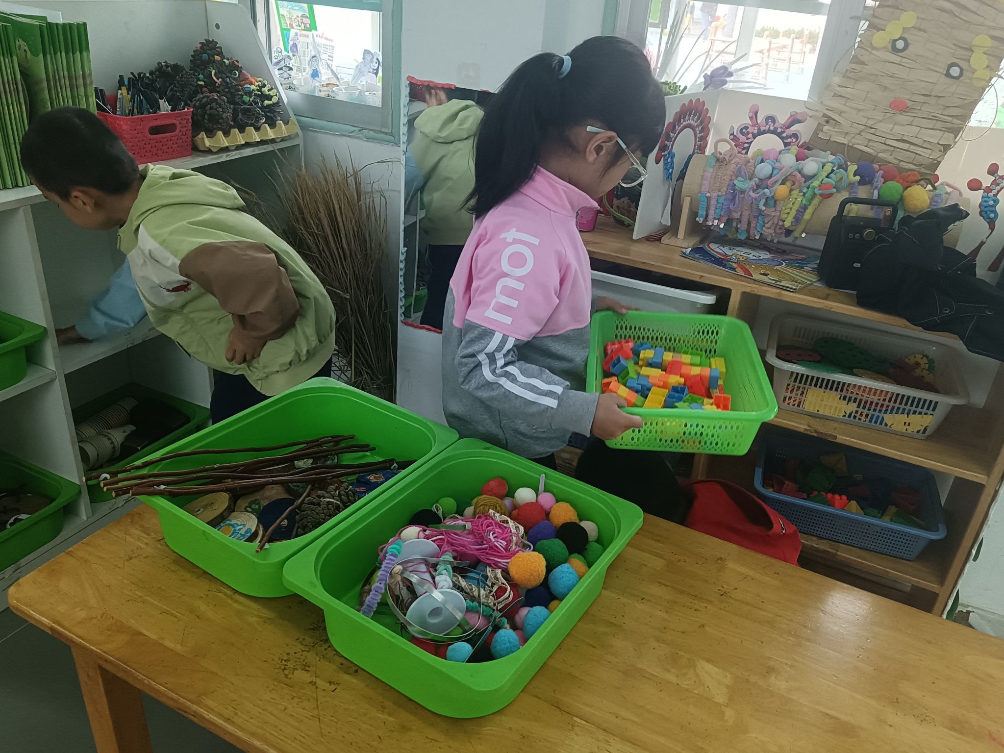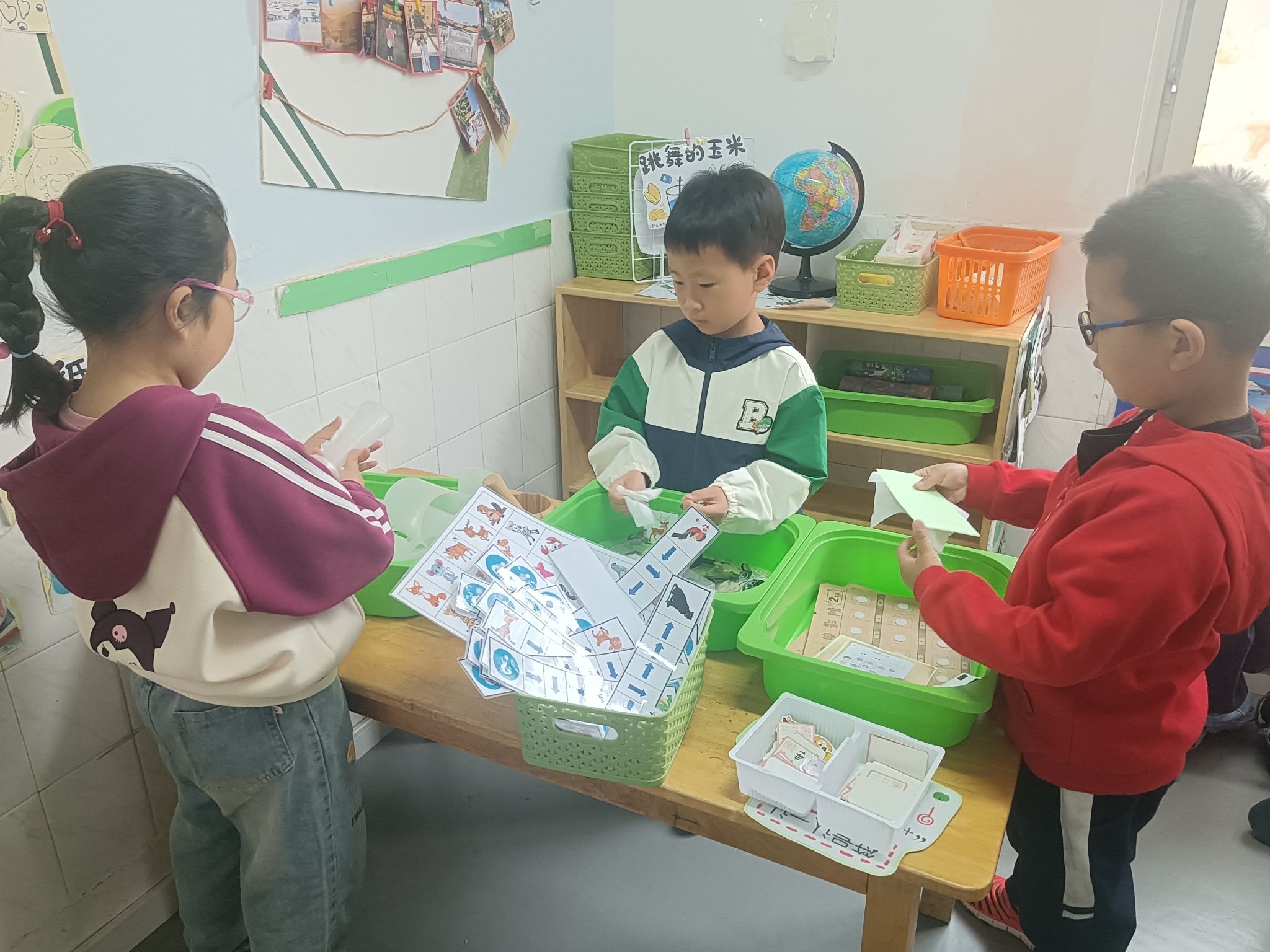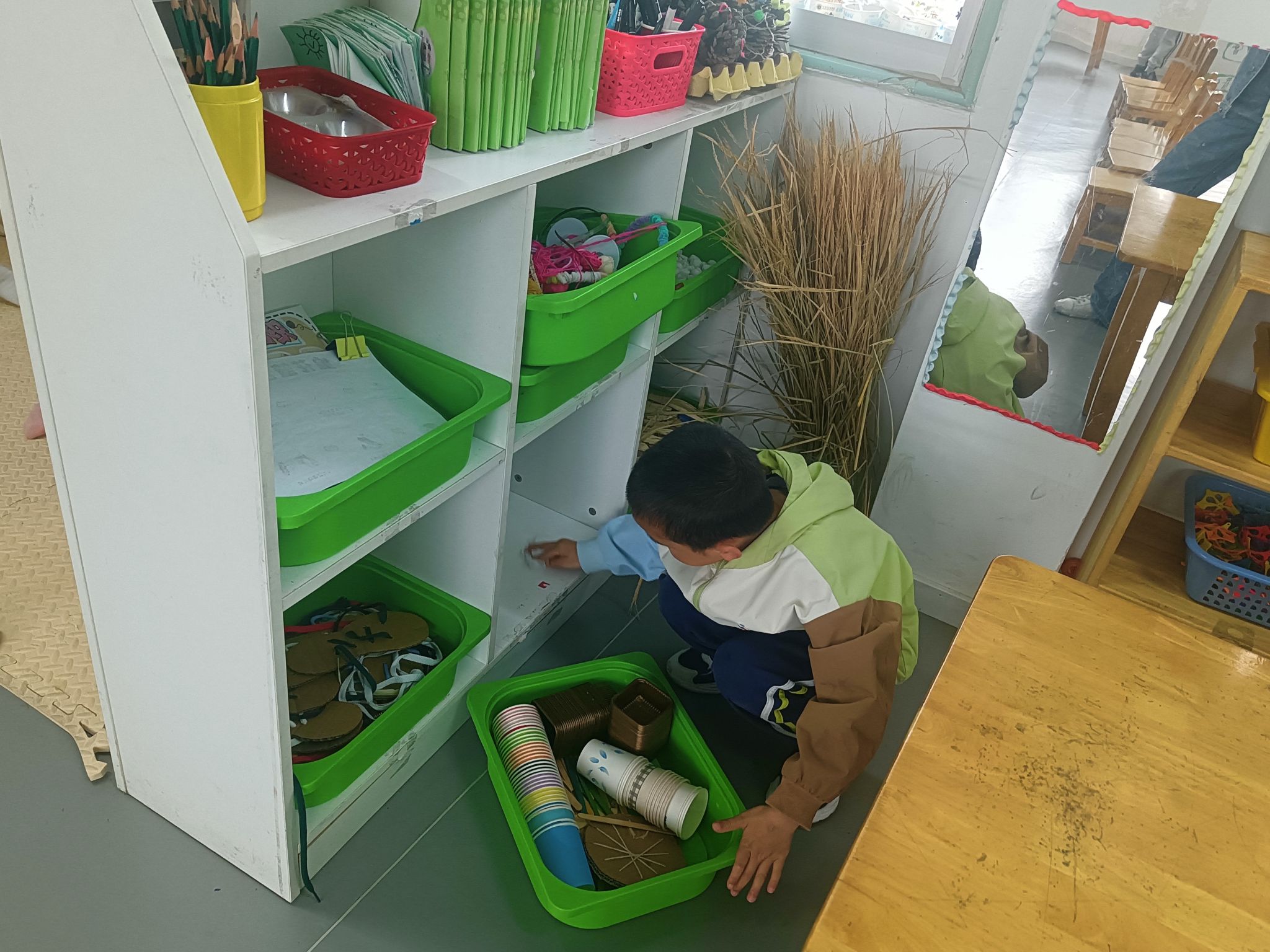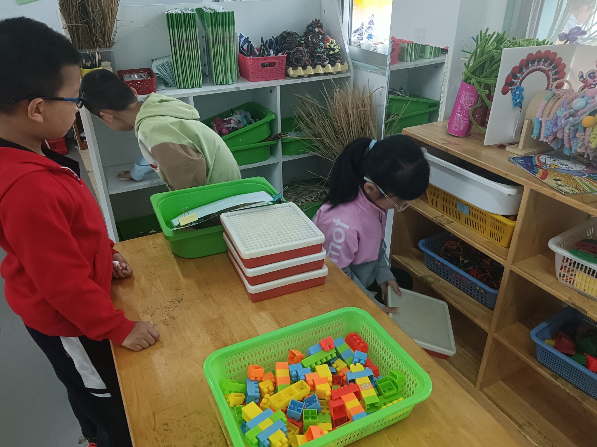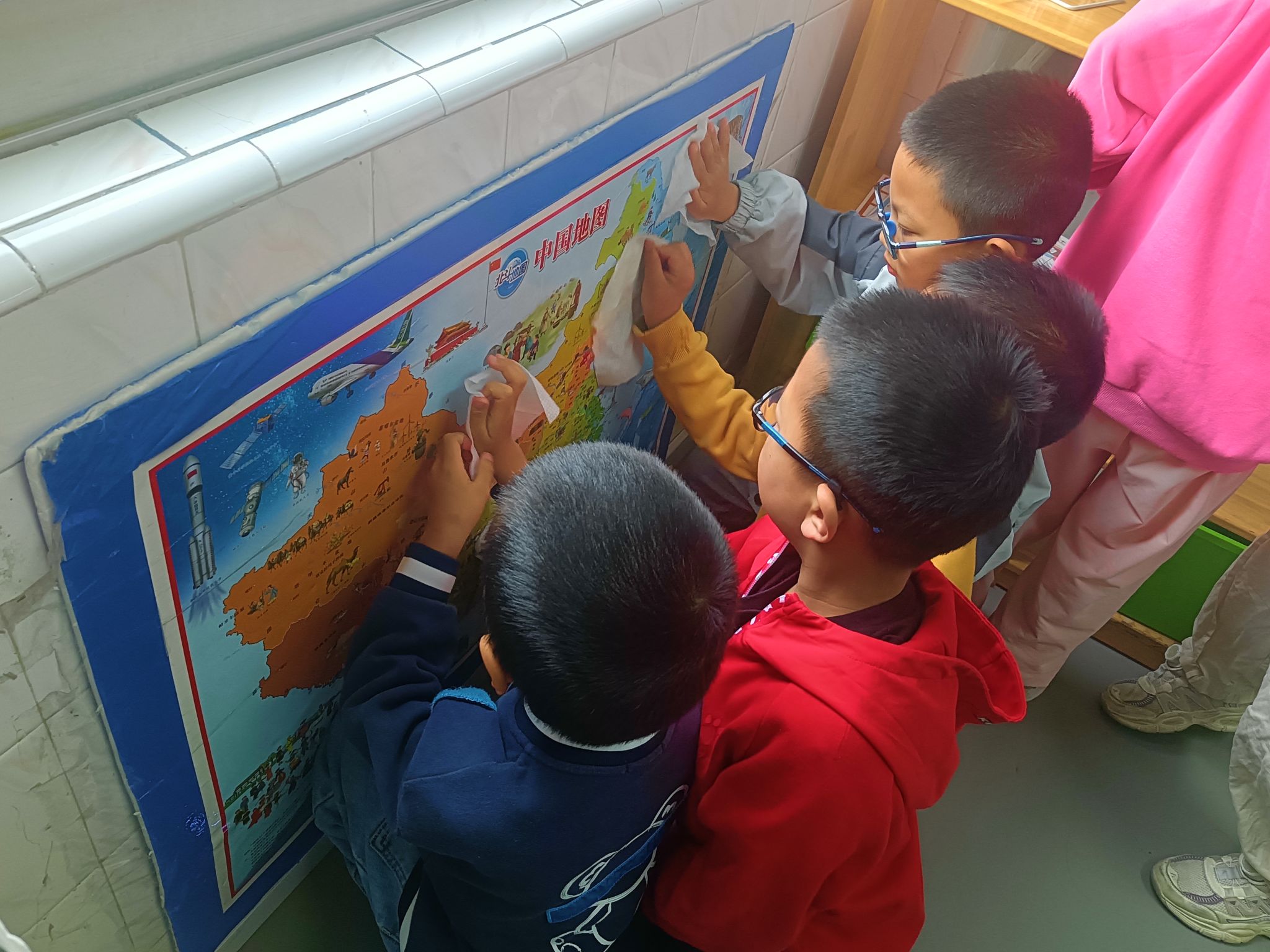 马上就要劳动节了,孩子们一起讨论“劳动节我们要做些什么?”,大家一致决定把教室整理、清洁一下,你看!游戏区角、玩具柜、桌面、玩具,每个地方都不落下......