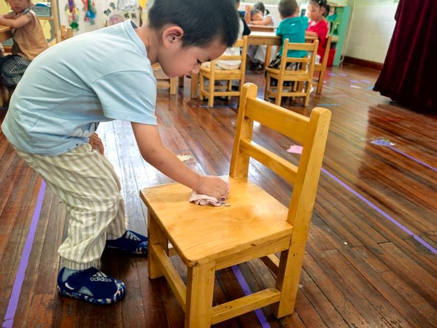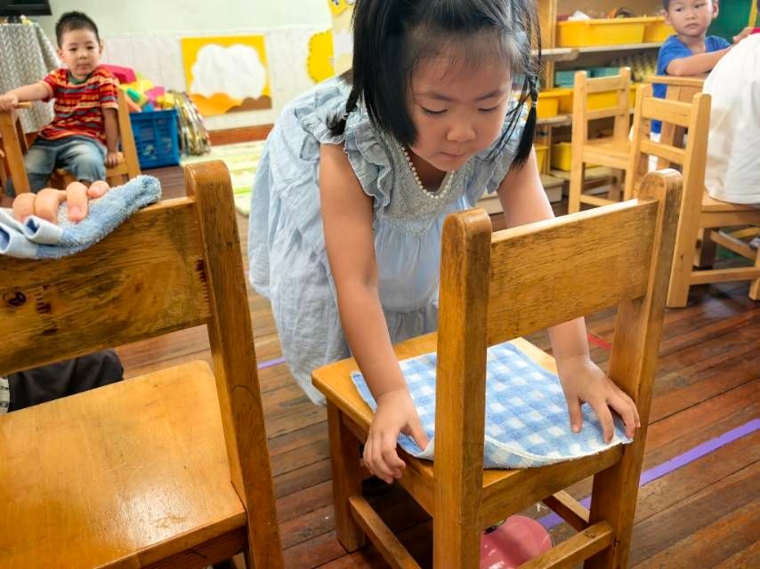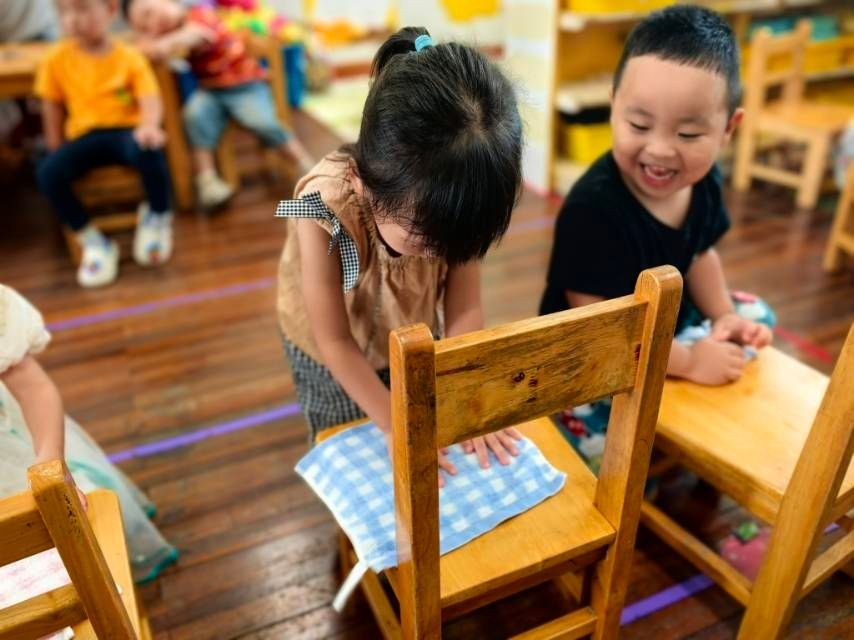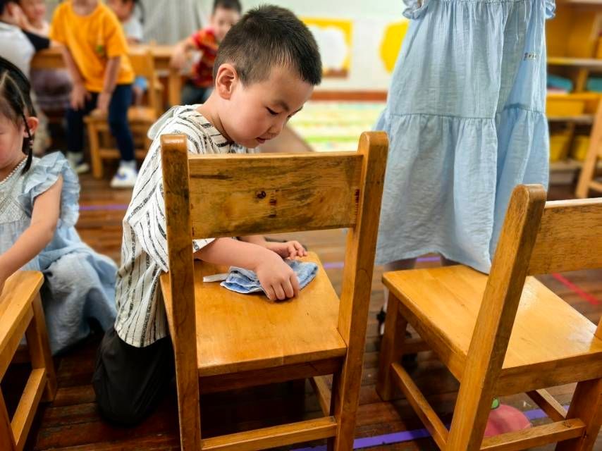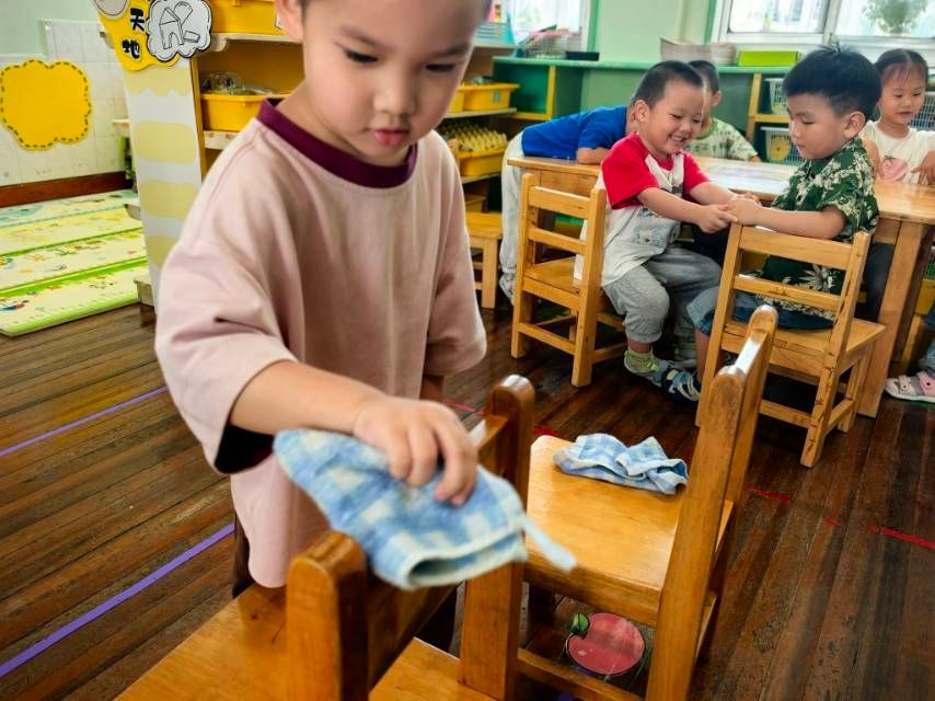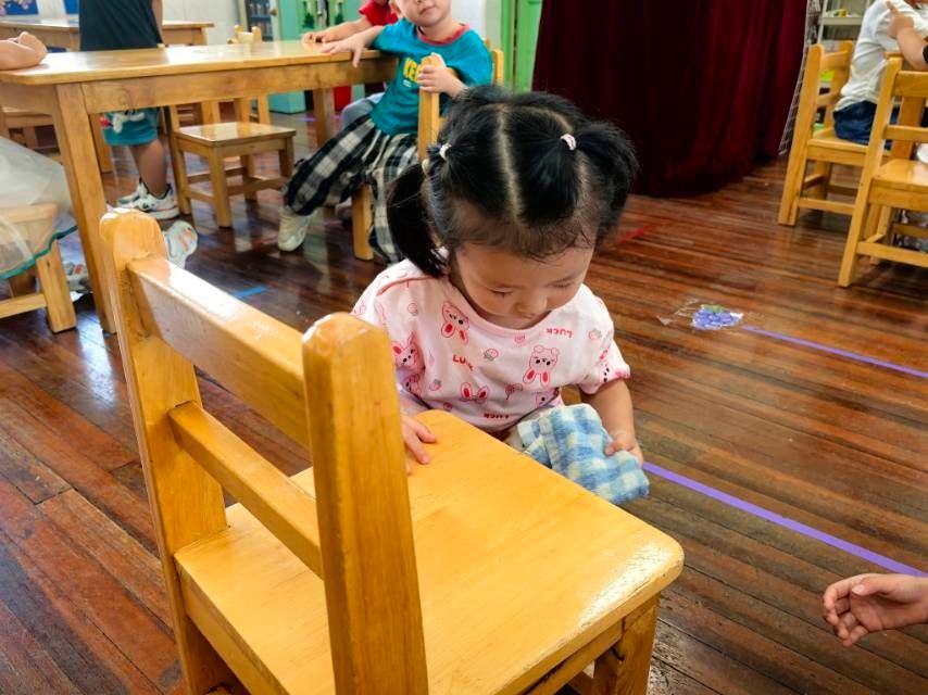 今天小朋友进行活动《我会抹椅子》,和老师一起初步学会按顺序抹椅子的方法,愿意将自己的小椅子擦干净。