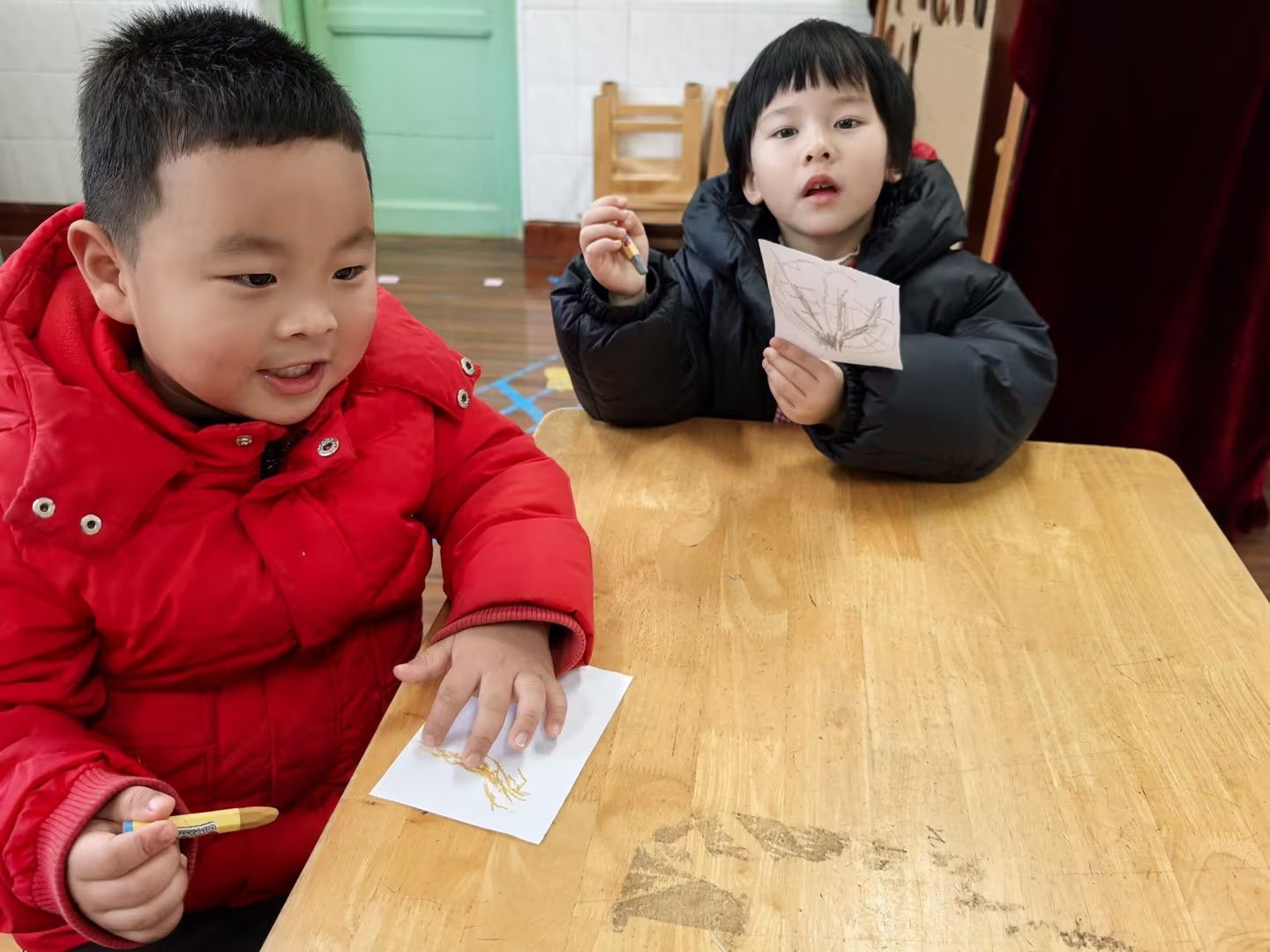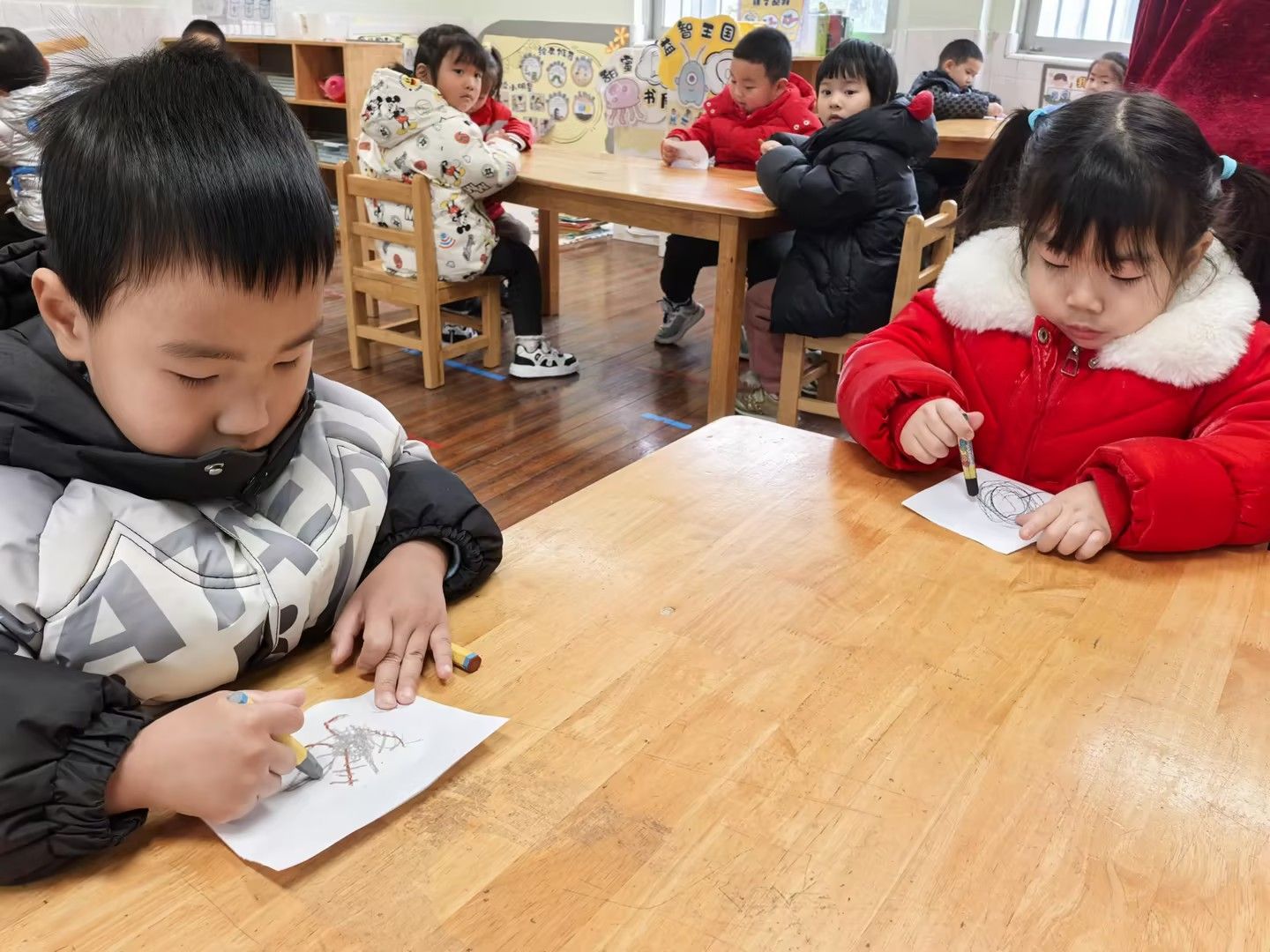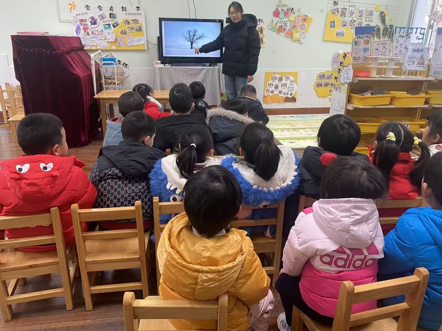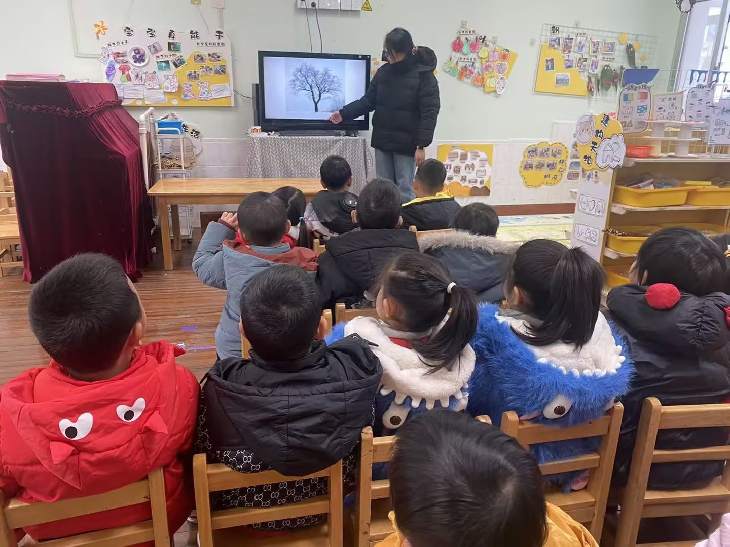 冬天到树好像和秋天不一样呢!今天小朋友们和老师一起观察冬天到落叶树,知道了大树妈妈的树干和树枝。通过观察比较,初步了解冬天的树的变化和特点。尝试用线与线的组合,表现冬天的树。